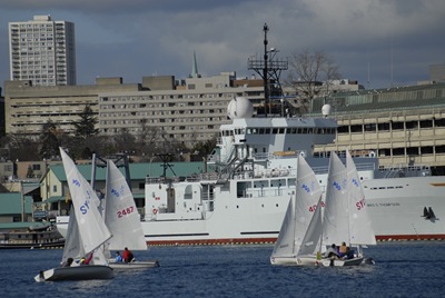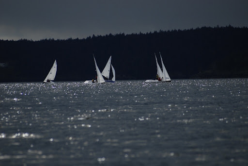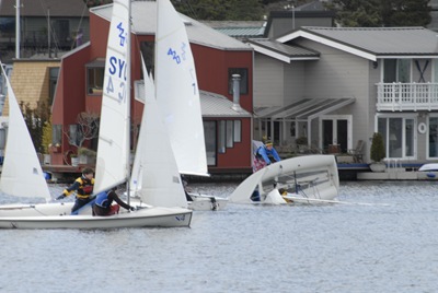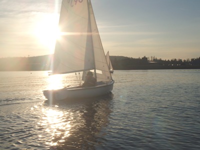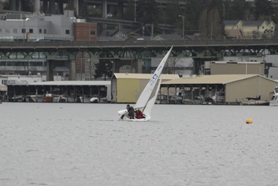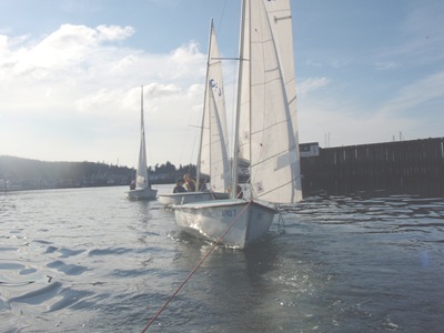 Max and Jesse approach for the rotation. Jordan and Lily, as well as Max and Jesse, were finishing near the back of the fleet in the morning. But by afternoon, had improved and were finishing in the middle of the fleet or better. Just think what we could do if we had these boats to sail in all the time!